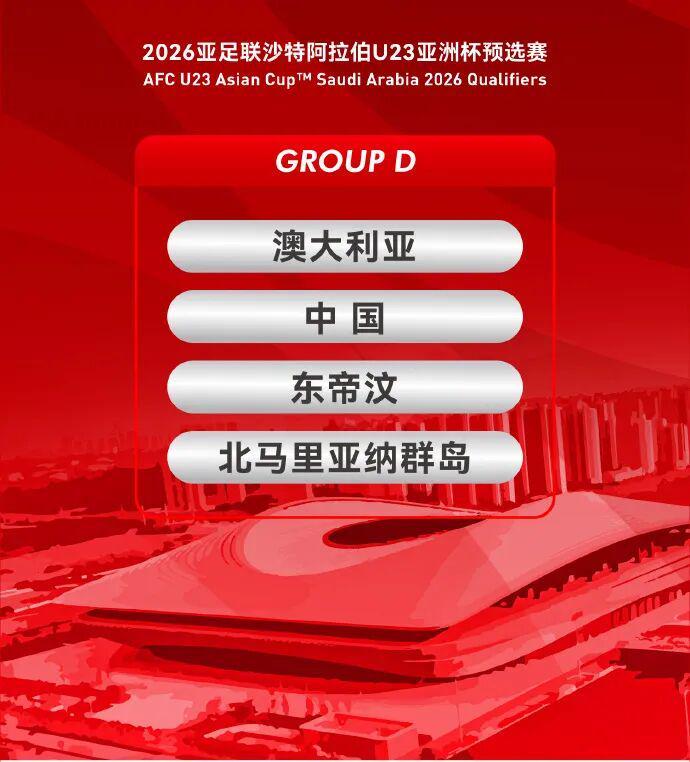 9月3日至9日期间,2026亚足联U23亚洲杯预选赛将在陕西省西安市进行。本次预选赛共分为11个小组,各小组第一名和4个成绩最好的小组第二名,将晋级明年在沙特阿拉伯进行的U23亚洲杯决赛阶段比赛。中国U22男足与东帝汶队、北马里亚纳群岛队和澳大利亚队同在D组。